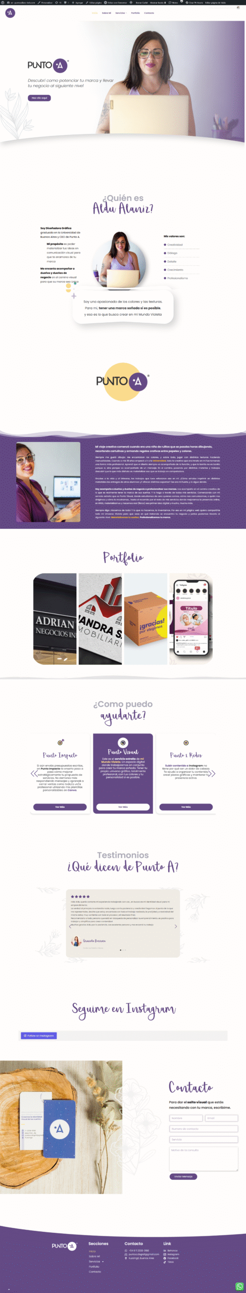 Punto A es una plataforma digital completa, diseñada y desarrollada por mí, para ofrecer una amplia gama de servicios de diseño gráfico, incluyendo branding, manuales de marca y contenido para redes sociales. Este proyecto fue posible gracias a las habilidades adquiridas en un curso de WordPress en Coderhouse, lo que me permitió aplicar mi certificación en un trabajo real y funcional.